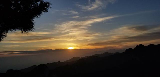 西峰出发(19:16)不到1个小时就能到达东峰,夜深且体力耗尽走的越来越慢,途径到二仙坎的标识后也就快到东峰了,当然还是要再爬很多的台阶才能到达要入住的东峰饭店,住宿是8人一间的,住宿费节假日按照床位费也不便宜,为了看日出方便也就凑活一晚了。早上的日出时间是6点05分,早早的大家就往东峰爬占据一个好位置,我们这有人腿脚不便就选择在院内观日出,也就是鹞子翻身的入口处。感觉当天雾朦朦的都没有看到太阳初升出地平线的效果,只感觉有一片金光铺面而来天就这么亮了。由于有人的特殊情况中峰没有去,其实时间尚早还可以去趟中峰,然后走回到北峰去坐索道。我们是直接从东峰走到了附近的西峰然后就坐了西峰索道下山了,西峰索道下去后还需花大巴车的钱送到旅游中心,这段路程还不短需要40多分钟的时间。