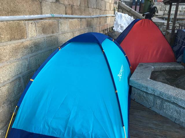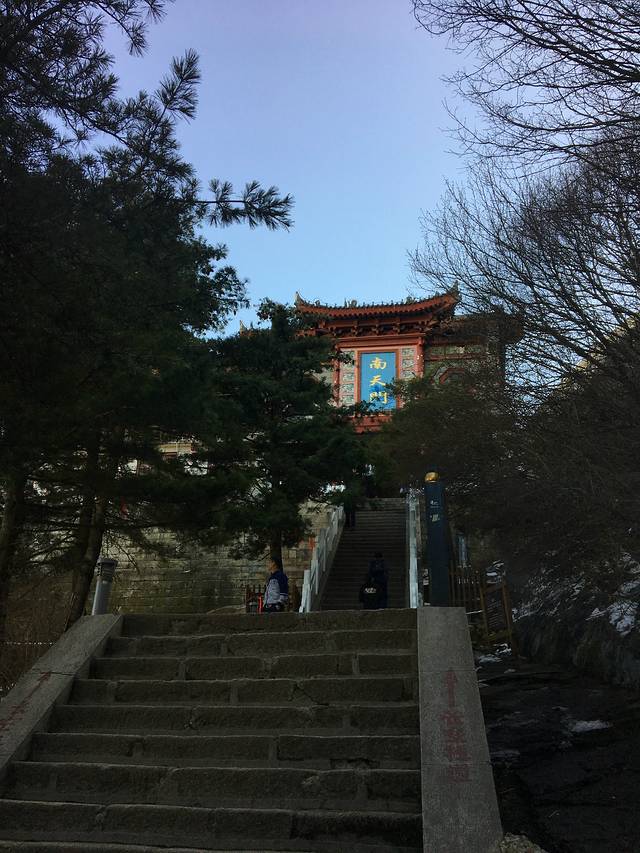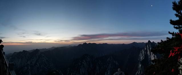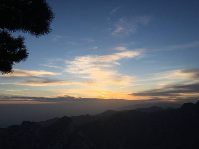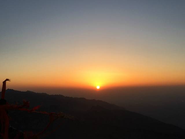 由于当天的日落时间是在晚上7点,到达西峰后选择了西峰饭店就餐,炒饭和面条都是30多,爬山很耗费体力,需要先填饱了肚子,在山上这个饭味道还算可以。观看太阳落山的过程是冒着寒风吹的,太阳变成了一个大火球呈现出耀眼的红色,慢慢的越变越小,在某一瞬间那么一跳跃就消失的无影无踪了。太阳刚落山的时候天还有微微的亮光,没那么一会就黑天了,我们也要在夜色中赶路去东峰,路途中结伴了两个姑娘,一路上走起来轻松了许多。