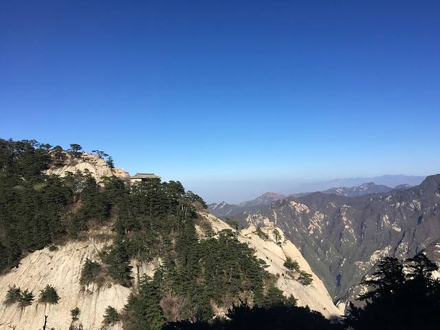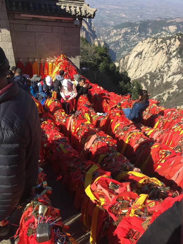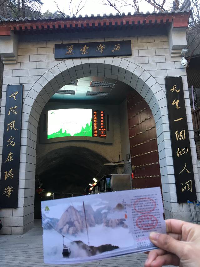 由于没有提前订酒店,昨晚住的鼓楼附近,所以还是得早起去赶早一点达到华山北的车。如果选择步行的话从北站下来之后打车去玉泉院,省时又省力,20块钱以内的车费。城市公车是免费到景区去游客中心,景区免费班车在送你到玉泉院,但会等人塞得满满的才开,华山的门票在玉泉院也是可以买的,方式限为现金,所以说稍微多带点现金,不然只能各种转账借钱了。埋头一路狂爬,走一段就能看到相应的路标及介绍,每次到一个路标的拍照都还挺有成就感的,体力瞬间恢复了不少,开始路是平缓的,慢慢的略微上升,一路上记录下所用的时间,希望对大家可以有些帮助。登山路线为:玉泉院(9:20到达)→五里关(用时40分钟,华山天险第一关)→莎萝坪(用时1小时多点,第一块山间盆地)→毛女洞(由于中间吃了点东西歇了好久,用时2小时坡路变成台阶)→响水石(用时2时20分钟,有平台可拍照)→青柯坪(用时2时40分钟,被称作小蓬莱)→回心石→千尺幢(用时3小时,华山著名险道,坡陡70度,阶宽很窄需侧足向上拽爬)→百尺峡(用时3时15分,90度,比千尺爬起来累,但距离短)→老君犁沟(用时3时35分,至此消除杂念,忘掉烦恼)→北峰云台(最低峰,到此用时4小时)