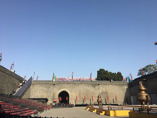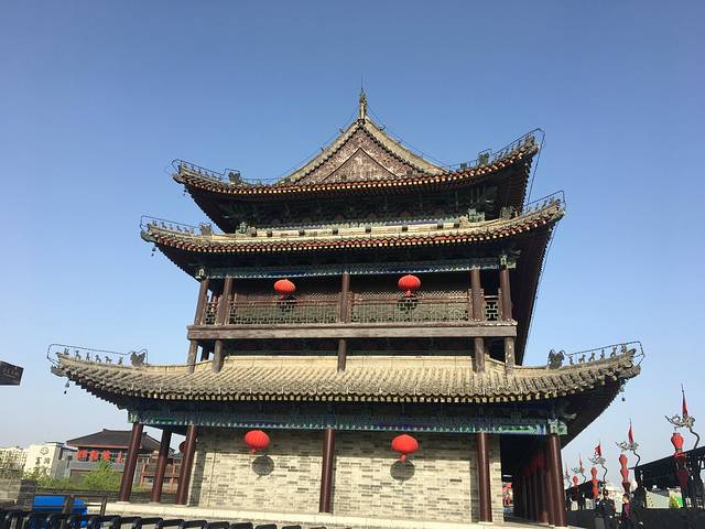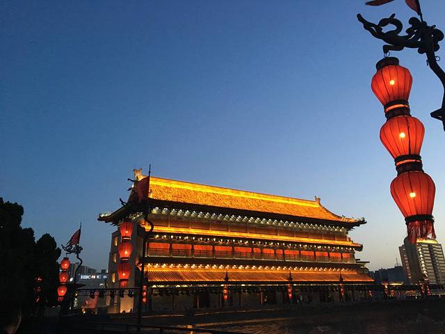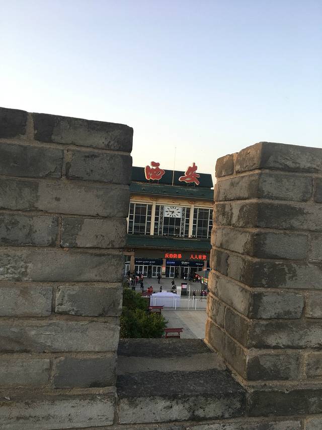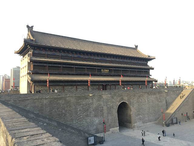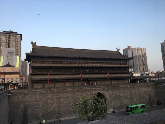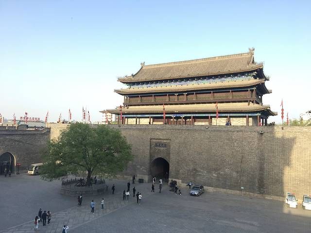 西安城墙是世界上历史最久远最壮观且保存最完整的城墙。不到20分钟就达到了永宁门站,也就是城墙的南口,上城墙后租一辆自行车,步行走下来全程的话很累,一定要租辆自行车(45一人,200押金),虽然说有些路段地面不太平,人稍微有点多,但是大多数地方骑起来还是很顺畅的。一定让工作人员选择一个好骑的自行车,我骑了个白色的一路下来很费劲。3个小时之内还车,一共是有4个租车的点都可以还(永宁门的还车时间最晚,如果不能骑完全程,租车的时候咨询下其他几点还车),我们从永宁门起顺时针转了一圈,走走停停的大约花费了2个小时,这一圈转下来真的是很过瘾。推荐在5点左右来城墙,这样你既可以看到西安城区白天的景色,夜晚的鼓楼也尽收眼底。看着这世界上现存规模最大、最完整的古代军事城堡建筑,不得不称赞古代筑墙技术的强大,才能让我们看到这“城中之城”的格局。骑着自行车不知不觉就到了夜晚,晚上不同时段似乎是有表演的,需要另外购买票,周围围得很严实是看不到的,但站在城墙上看看周围城区的灯光夜色也是很美好的事情。城墙骑行很耗费体力,导致了第二天爬山丧失了部分战斗力,但感觉不枉此行。补充体力是在回民街吃的,离城墙步行前往就可以,人太多相比较之前端午过来完全两个样,吃了熟悉的羊肉泡馍和贾三灌汤包。据说当地人会选择洒金桥附近吃小吃,实在是走不动了,如果再来可以选择这条街尝一下美食。