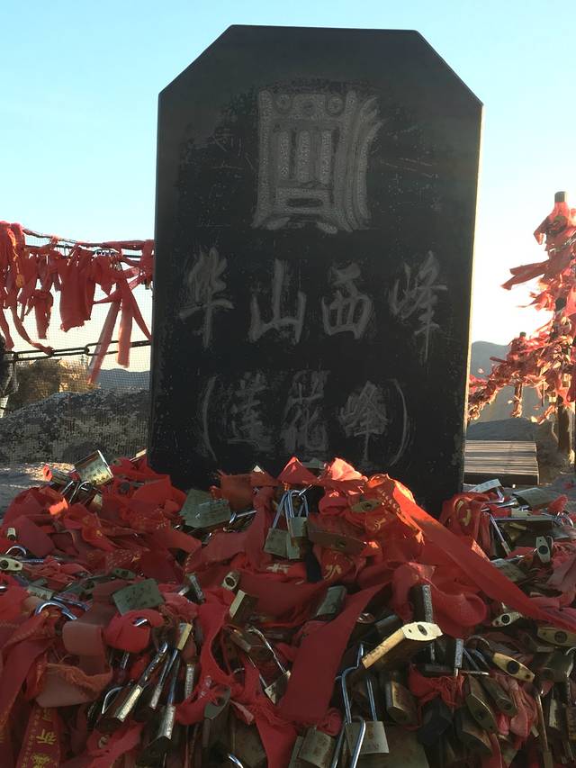 北峰(13:50)这里有索道80单程,我们在此休息下后向南峰出发→擦耳崖(14:00路是比较窄,但也没有擦耳的效果)→苍龙岭(14:25韩退之投书处,登山险道,登上后有一览众山小的效果)→五云峰(此处有住宿)→金锁关(15:42,东西南峰口,观赏东峰仙掌崖的绝佳之地)→南天门(16:25我们并没有进去,里面有长空栈道30元一位)→南峰落雁(17:05华山极顶,只有天在上,更无山与齐)→埋头爬啊爬→西峰莲花(17:45)
