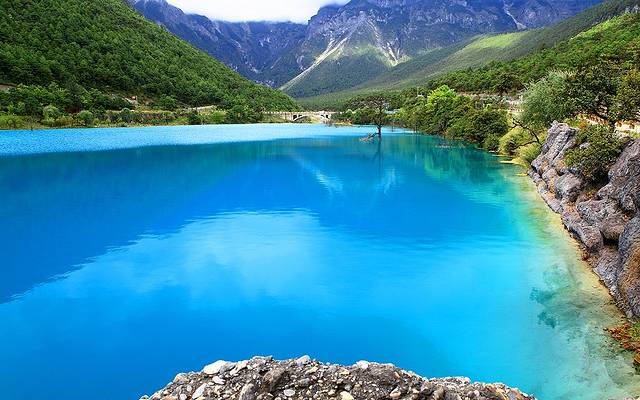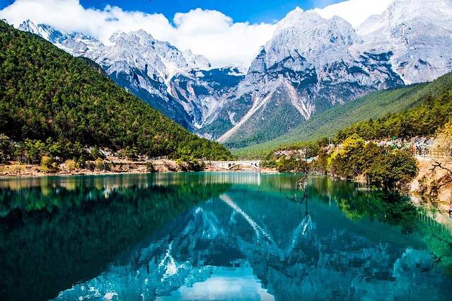 蓝月谷,其前身为早前人们所熟知的“白水河”。在晴天时,水的颜色是蓝色的,而且山谷呈月牙形,远看就像一轮蓝色的月亮镶嵌在玉龙雪山脚下,所以名叫蓝月谷。而白水河这个名字是因为湖底的泥巴是白色的,下雨时水会变成白色,所以又叫白水河。