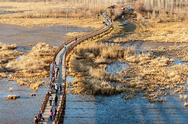 草海中最著名的是有着“天下第一鹊桥”之称的走婚桥,它是草海芦苇丛中延伸出来的一座长达300米的木桥。原来有近百年历史的老桥部分木头已经腐烂或毁坏,散落在草海中。现在这座与老桥紧邻,是后来重新修建的,微风一吹,扬起纷飞的花絮,像仙女撒下的雪白花瓣。走婚桥横跨草海,穿过芦丛,直达两岸村落,为两岸村民、“走婚”的“阿夏”们提供了便捷的通道。历史上,走婚桥还是左所土司喇宝臣的汉族夫人去后宫的一条捷径。