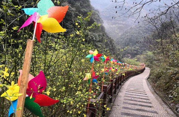 下索道后,一路上百鸟喧鸣,仿佛奏起了一曲永不止息的乐章,连微微颤动的树叶都好像在歌唱着,林荫小道间开着朵朵小花,腼腆又害羞。