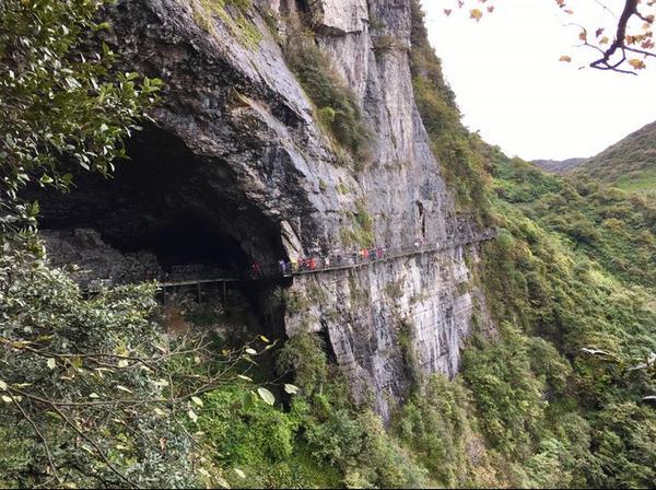 金佛山的绝壁栈道惊险又刺激,蓝天白云下,行走在海拔2000余米、离地面有40至50米余米之绝壁山腰间,一路欣赏金佛山的风光,虽然步步惊心,但美景一览无余,也确实是一种特殊感官的体验。