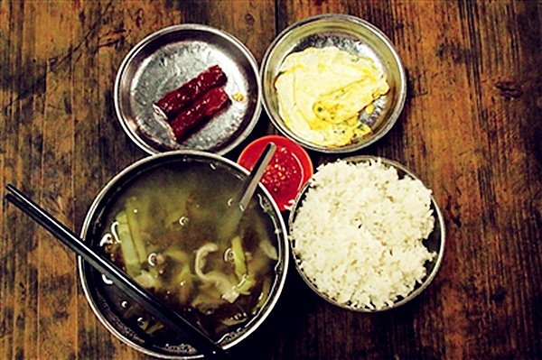 骑楼老街的辣汤饭,终于又能去店里吃了。据说海南人最古老的早饭是辣汤饭。标配是一小碗白米饭,一份酸菜猪杂汤,煎荷包蛋一个外加一根琼式腊肠。