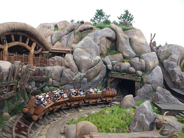 ②七个小矮人矿山车(梦幻世界):上海迪士尼乐园里面比较热门的项目之一,常年排队需要1到2小时的项目,钢制仿木头样式的过山车,七个小矮人主题。在七个小矮人的矿洞里急坠和冲刺,整个体验是半室内半室外,景观环境漂亮而逼真,非常刺激。