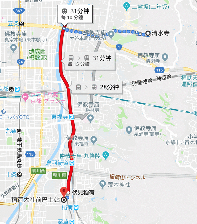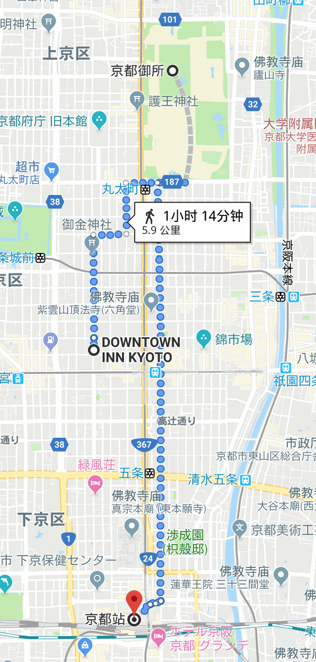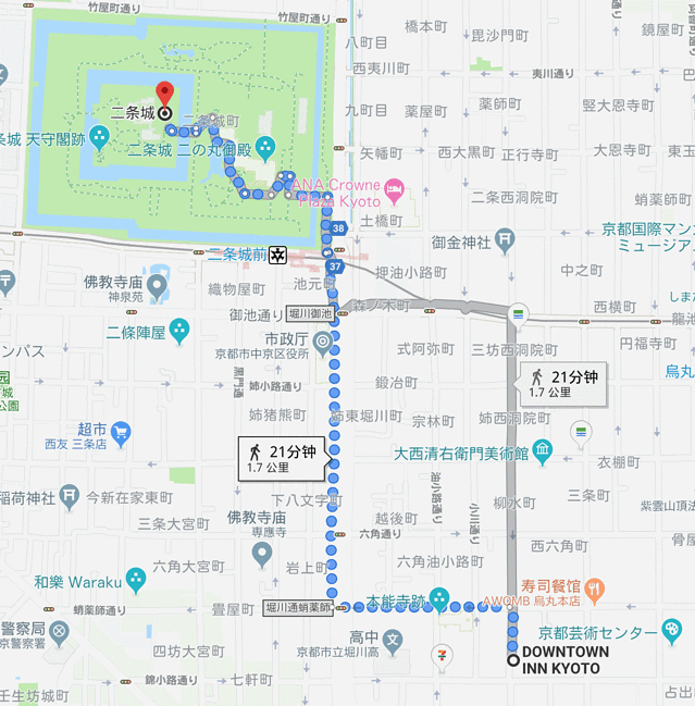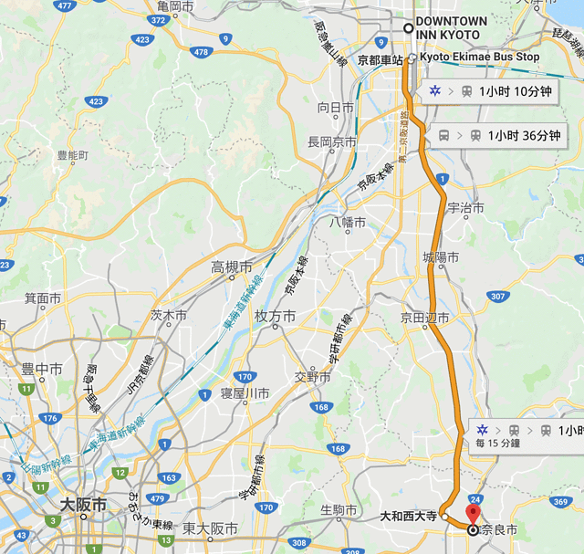downtown Inn 步行到 京都站 火车到奈良, 你可以看到这三地的关系,差不多一个三角形~~