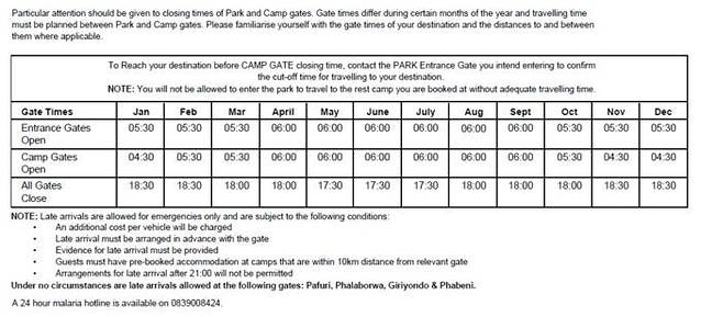 一是要注意克鲁格公园的关门和开门时间。如果超过了关门时间入园,需要打电话给自己定的营地,报车牌号,等待他们派人和车来接,同时缴纳500兰特的罚金,方能跟着营地的人一起入园。