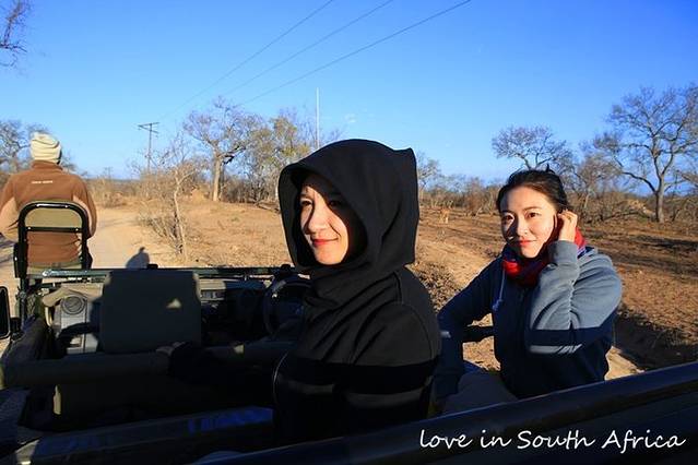 虽然都是一个司机和一个tracker,与公共营地不同的是,tracker坐在加装的车头高椅上,视野开阔,方便他们追踪动物的身影。一路上他们都拿着对讲机,与其他tracker互相交流,听说有人早上看到了狮子带着7只新出生不久的小狮子,听得我期待不已。