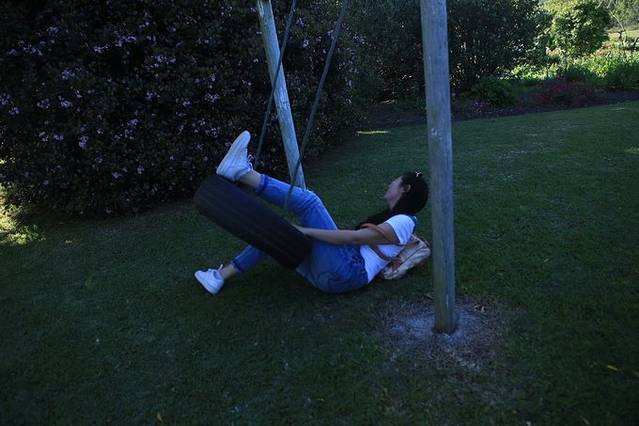 好在一路上阳光明媚,青山如黛。我们路过一个狂风呼啸的暴怒海滩,披头散发留下风中凌乱的照片;路过一个没有主人的静谧花园,从秋千上跌倒狼狈又欢乐;路过一片洒满金色的斜阳海滩,深一脚浅一脚在细软的沙滩上撒欢儿。