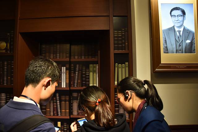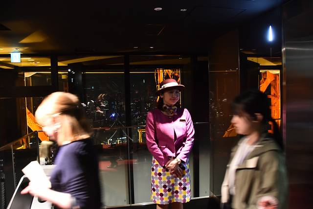从一层开始就有很多日本的女性服务员在引导解说,并每位游客发一个翻译机。然后疏导游客有序排队乘坐电梯以防拥堵。