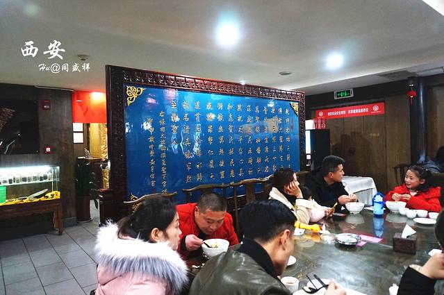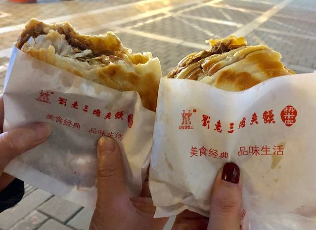 说回正题~~ 青旅check in 之后,就是为了填饱饥肠辘辘的肚子奔波,提早物色好的餐馆,排到35桌,算了,路上见什么吃什么吧~ 第一站居然就是肉夹馍!!! 我本来以为咬一口我就会扔掉的食物,结果吃完了,还蛮好吃的诶!我妈原来是有在宁波吃过,说是极坏吃的。大概是刚刚出炉的关系,肉很软,饼很酥,热热乎乎的,立马对它产生好感