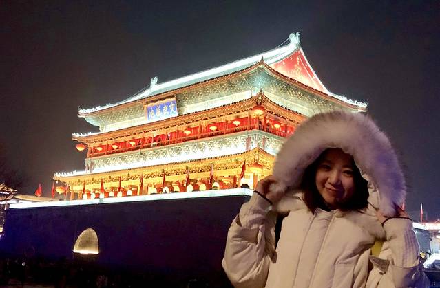 从碑林出来去了趟青旅,换了身衣服,想着晚上去大唐芙蓉园会冷~ 都挂了付手套,手套这东西不是冬天去北方旅行,真心是用不到啊,宁波好像没有什么机会可以用到。。。先来个合照