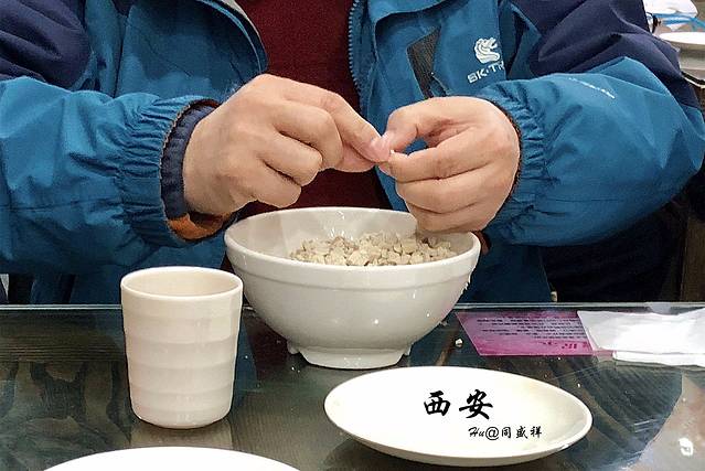 然而对面拼桌的本地大叔,跟我们差不多时候到的,我们吃完了,他还在掰。。。。我们攀谈了一会,说是就是要掰到这么细,大概吃一份泡馍要1小时的时间,而且平日里馍都是整张给的,全靠自己,这几天纯属人多,怕来不及,才给掰好的