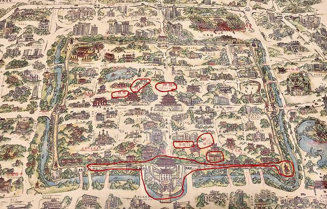 鼓楼的背面,顺着人流,就开始正式进入回坊地界了,也就是著名的回民街啦 我大致标出了我们的路线图,走完了北院门和西羊市,北广济街一大半,没有走大皮院