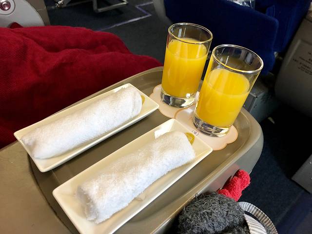 一落座就有空姐帮忙挂衣服,给热毛巾和果汁,还能解放双脚~~ 老妈也表示灰常满意~