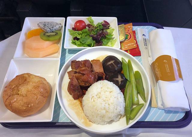 一飞就能睡的我,一直睡到发午餐了才醒过来,餐食也是不一样啊,有考究的器皿,终于不是塑料的了,餐具的质感很能提升一个人的食欲啊,水果也是现切的样子,色彩丰富~,不是冰冻货,排骨饭很好吃