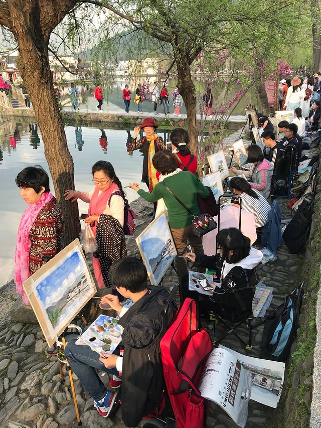 沿湖一串写生的学生们,景在画中,画在景中。