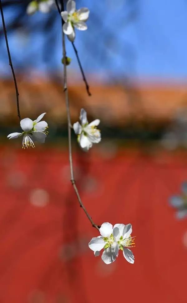 漫步在朱墙石栏间,一树白花映红墙