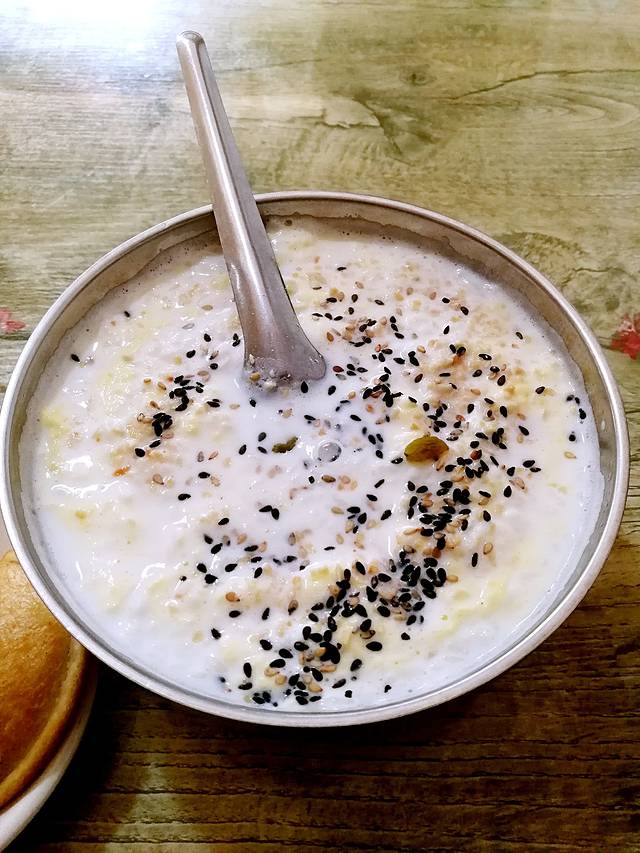 鸡蛋牛奶醪糟,不太甜,里面加了葡萄干调味,而且上面又加了芝麻增香,五星推荐。