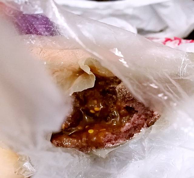 路边的黑米糕,因为吃不下,一路背到机场,在飞机上一口咬开,慢慢幸福感溢出来,红糖里加了芝麻,核桃,三元一个,在莲湖公园往宾馆回去的路上看到的。