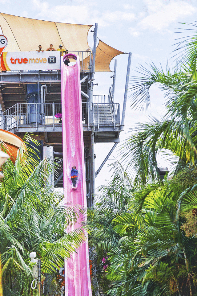 第二个是全泰最长,长179米的Boomerango滑梯,还有全亚洲最高的人造瀑布。夜幕降临时,璀璨的装饰灯亮起,更是美丽壮观。