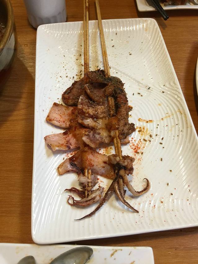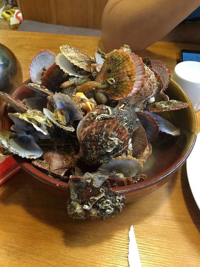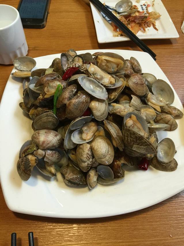 看了看日照的特色,决定选择这家离酒店不是太远的日照人家店,由于怕周末人多所以现在大众点评上预约了这家店,我们在预约时间之前赶到店里但是被告知没有位置,所以就在大厅里等了一会,不过服务人员的态度挺好的,一直向我们打招呼,等了15分钟的样子有位置了,于是就让老公带着小孩去坐,自己先去点菜了,点了白煮扇贝,辣炒蛤蜊,烤鱿鱼,烤大虾,酱爆活八代,鲅鱼水饺,儿子点名要了卷心菜炒翅丝,饮料点了苹果汁一扎,其实这个蔬菜还是不错的,这家店煮的菜的味道还不错就是感觉扇贝这个烧法我不是特别喜欢,其他还能接受,但是后来菜都上完了饮料还米有来,所以就把苹果汁退了换了一瓶可乐,这样一桌菜228元,价格也比较实惠,菜量非常大,这点我非常喜欢。