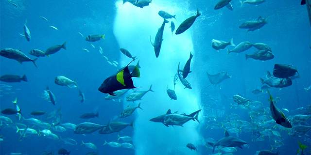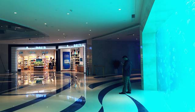 相对暗的环境中,一个个巨大的水族箱带来了新鲜而炫目的视觉享受。