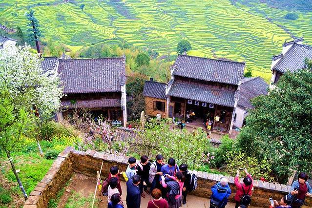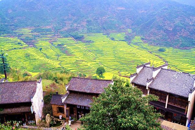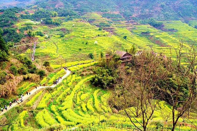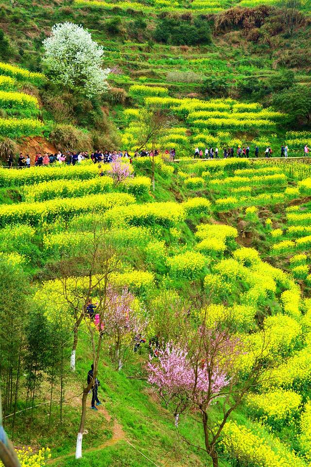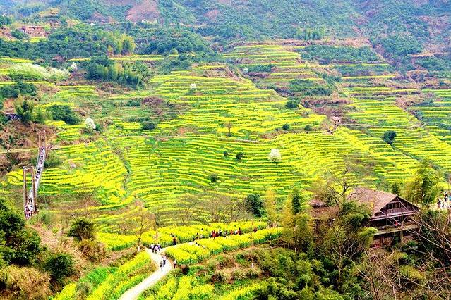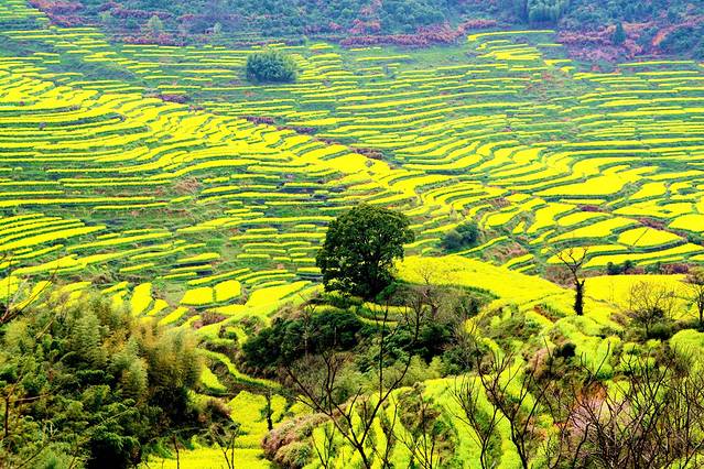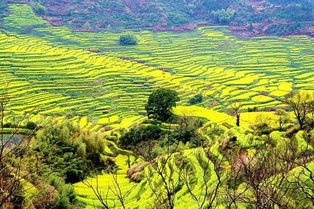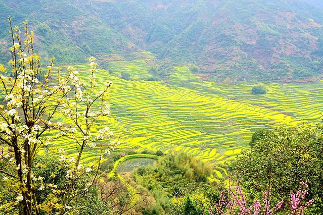 江西婺源篁岭被誉为“全球十大最美梯田”之一 。地处婺源石耳山脉, 面积5平方公里,周边千亩梯田簇拥。阳春三月,婺源篁岭山间油菜花全面盛开,千亩梯田油菜花同时绽放,漫山遍野。篁岭以其独特的梯田地势与白墙黛瓦的徽派建筑群交相辉映,秀气而瑰丽。粉红的桃花、洁白的梨花,点缀在金灿灿的油菜花田中,俨然一幅的乡村田园画卷,春风吹过,生意盎然。