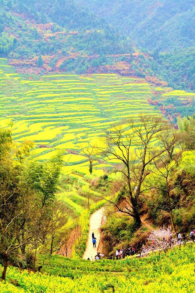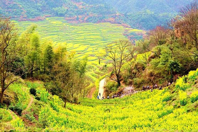 梯田随着四季的变幻,景色也各不相同,她好似山里的大妹子,不时在用各种色彩装饰着自己,有时显得妩媚、有时显得热烈、有时显得奔放、有时显得深沉……春天的篁岭,是一片金黄色油菜花的世界。初春的篁岭,天气一会儿寒、一会儿暖,一会儿晴、一会儿雨,虽有春的感受,但却隐约模糊。待到油菜花盛开之时,就是一幅春日融融、春风和煦的景色。