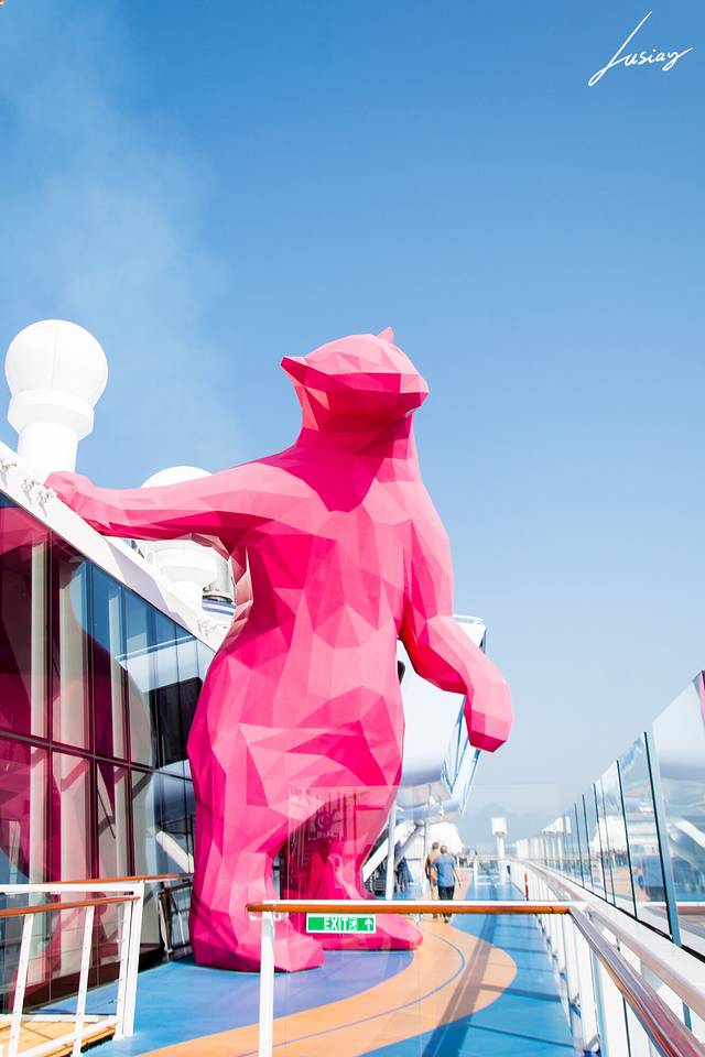 攀岩位于十五层甲板的船尾,旁边有只粉粉的阿法熊,9米多高,超级可爱。