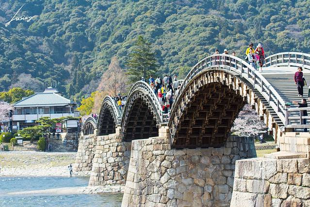 锦带桥是日本3大名桥和日本3大奇桥。由5座拱桥组成的桥体全长 193.3米、宽5米,精工技艺堪称精湛。桥的创意正是来自于杭州的西湖。在2004年,与西湖的锦带桥成为姐妹桥。