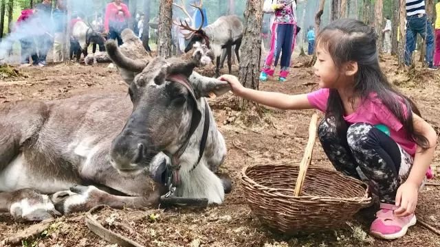 看驯鹿是很期待的一个节目。它们是森林精灵,小朋友也一直想和鹿儿们近距离接触。