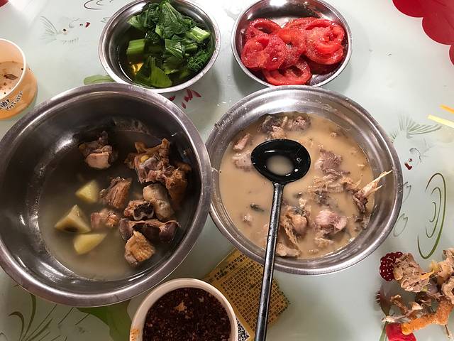 再说回菜品,菜品是老板自己定制的,四个菜一个蘸料:松茸土豆煲鸡、凉拌番茄、烫青菜、松茸鱼汤,随便加菜加汤加饭,管饱,35元一位。