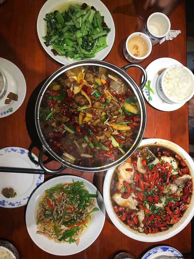 关于这里的吃,中午吃的红泥小火炉餐厅,环境跟出品都不错,清蒸荷花鱼、荷叶煎蛋、凉拌青笋、两亩地,相对比较清淡的一餐,鱼用来清蒸还是我们强烈要求的🌝。晚餐就真的很重口味了,还不能要求不放辣椒,因为没辣椒师傅不会做🌚,如果能吃辣的小伙伴还是可以推荐的,伴夏音乐餐厅,分量很足(见图),应该是这里环境最好的一家餐厅了。