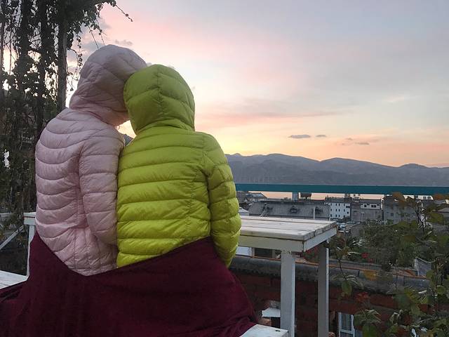 老板说客栈的楼顶可以看日出,日出时间大概是6点45分,我们早早爬起来,穿着睡衣裤,套件羽绒外套就上楼顶了🤣