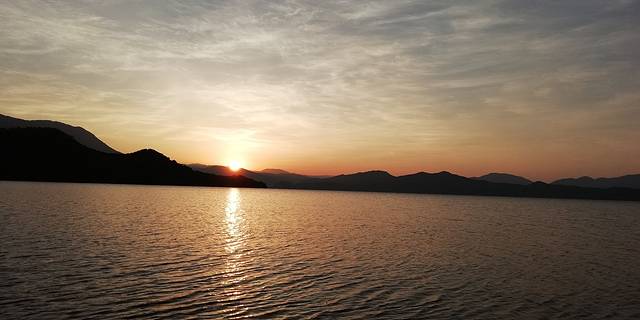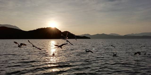 早上六点,楼下就有撑船的摩梭人就喊:看日出的起床啰~这里的日出时间大概是6点45分,我们六点20分起床的,刷个牙就出门了,看日出可以选择在观景台看日出,免费的,也可以选择坐猪槽船到对面的小岛上看,坐船每位30元,我们的客栈到上船点3分钟路程。建议坐船出去,无与伦比的美丽❤️回来的时候,湖中央有很多海鸥,可以带点饼干碎,一撒向湖中,一群海鸥飞扑过来,十分壮观。