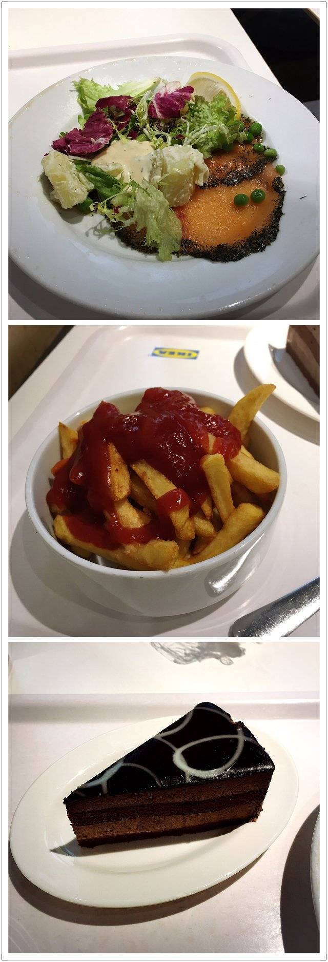 天气不好的遗憾,美食来弥补,开车来了宜家,也没逛家具和家居,点了薯条三文鱼沙拉和巧克力蛋糕,甜食的力量无穷大,吃完之后感觉舒畅多了~