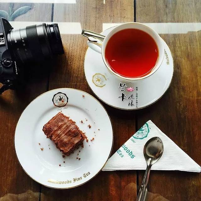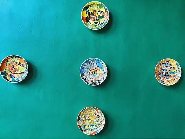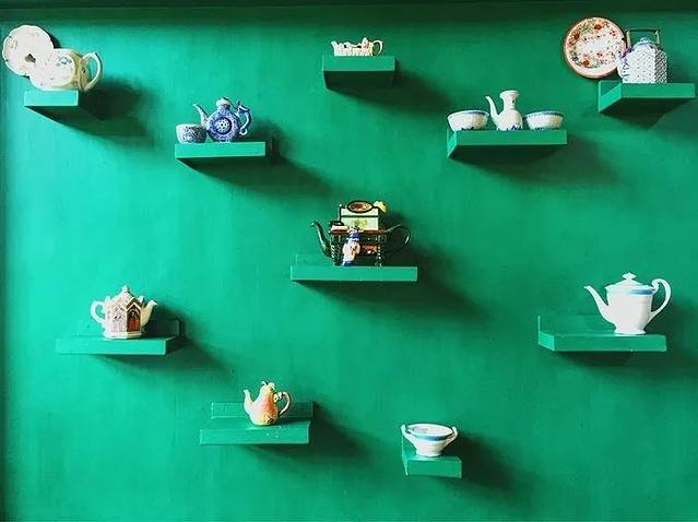 这里有专门品茶和吃糕点的地方,这面墙上摆满了各种好看的小茶壶、小盘子。