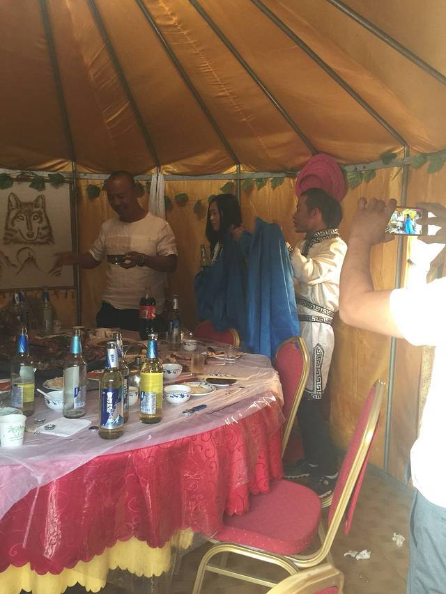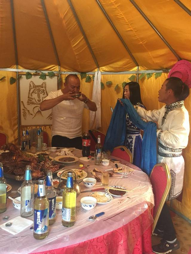 正喝的高兴来了几个小伙子和姑娘,穿着蒙古服装,原来是敬酒献哈达的,虽然收费但是想感觉一下,反正几十块钱增加点气氛。这坝上人喝酒真不是吹,这小伙子打一圈过来好像没喝一样,服了