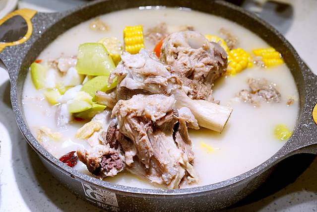 点了一道必点的招牌猪骨汤,里面有好多好多骨头和玉米、鹌鹑蛋等食材,在锅里煮着煮着咕嘟咕嘟,看着就好幸福。本以为一把骨骨头用作熬汤没有肉,可是让人意想不到的是筒筒骨上的巴骨肉竟然那么多,赚到赚到!还那么香那么好吃,汤相当鲜美,吃了一把骨还想再来一把,嫌弃自己的胃不够大。