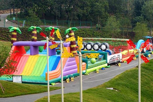 大连英歌石植物园的儿童乐园占地3万平米,主要是为4—12岁儿童提供游玩娱乐的场所。里面设有木质滑梯、攀爬网、太空攀岩仓、旋转球、体能训练、魔法树、秋千滑梯组合以及来自日本最高端无动力弹床等各种各样的游戏和游乐设施。照片摄于大连英歌石植物园。