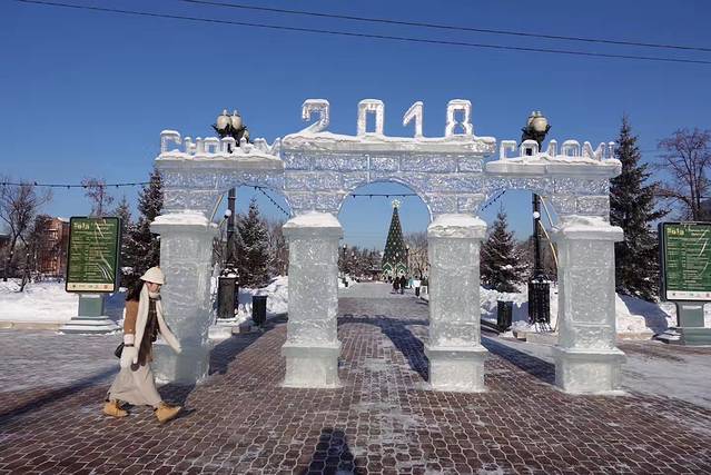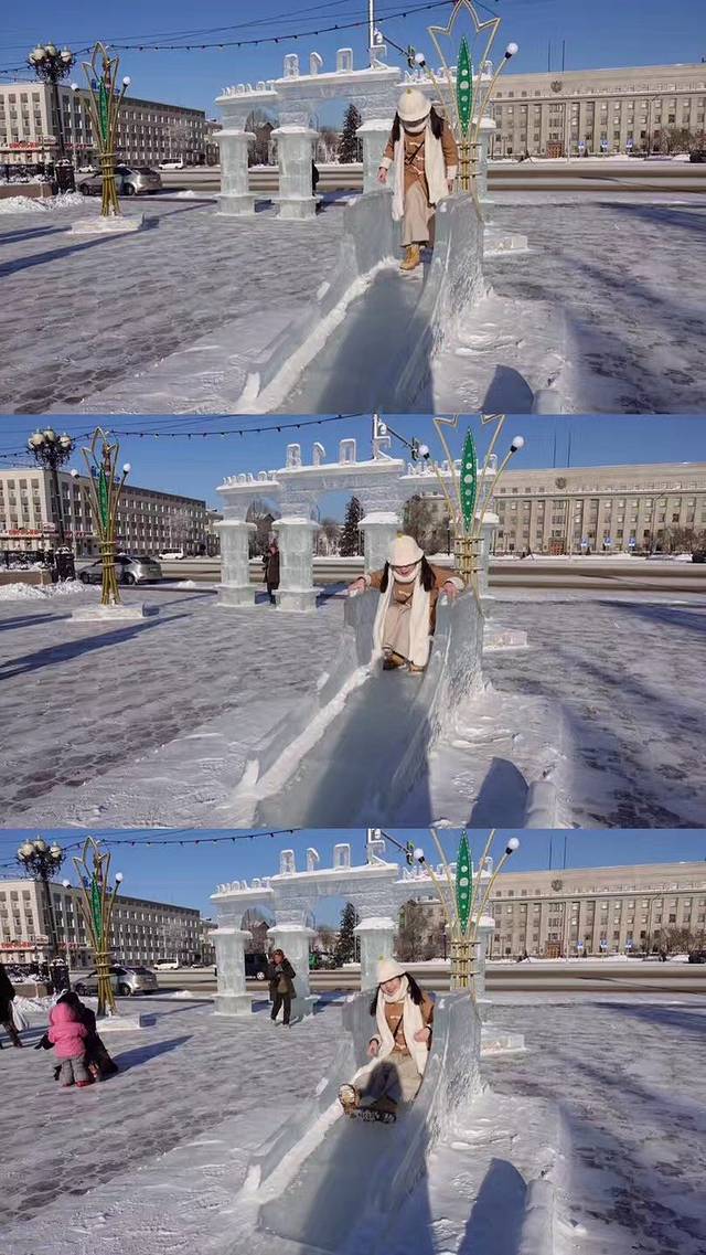 这个广场真的好有意思,有很多小的冰滑梯跟一个大的冰滑梯,还有很多冰雕,冰滑梯真的好好玩哦