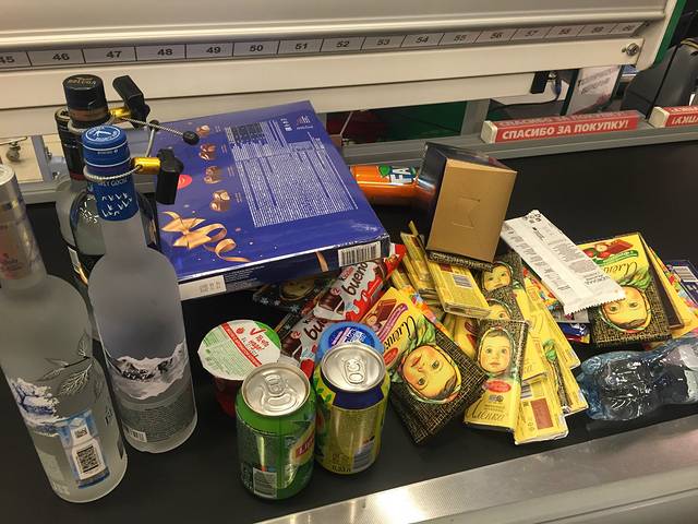 早上我们做巴士回市区,回酒店寄存箱子(并不入住)后就出来找了个餐厅吃饭,然后去了Tsentralnyy Rynok购物中心,从130风情街尽头再往前走一段就能看到,这是当地人去得比较多的一个商场,里面有个很大的超市,我们在里面采购了很多很多巧克力跟酒做手信,俄罗斯简直是酒的天堂!!我们2个比较怂只带了4瓶,我看到有人带5 6瓶的,主要我们回到香港还要过关,就不冒那个险了。酒的话建议直接在超市买,我后来在免税店看价格比超市还贵。
