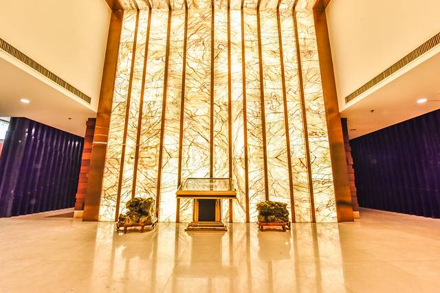 在进入酒店之前,门口的屏风设计的非常漂亮,除了起到阻挡外界山峰的冲煞问题之外,还起到了调节室内与室外之间的阴阳平衡的问题,设计方面颇具匠心。