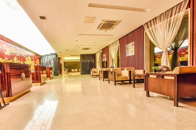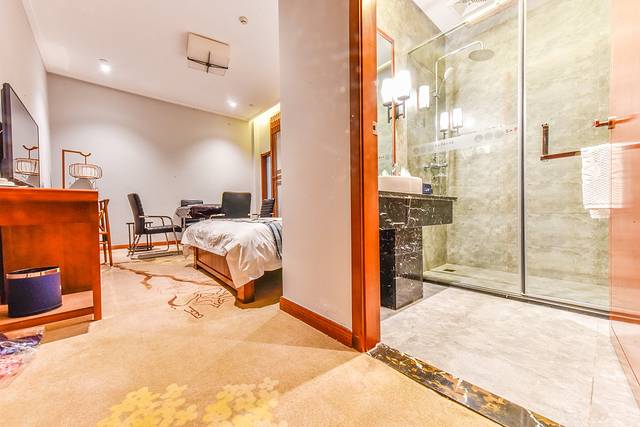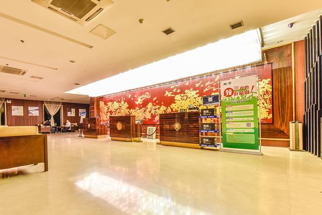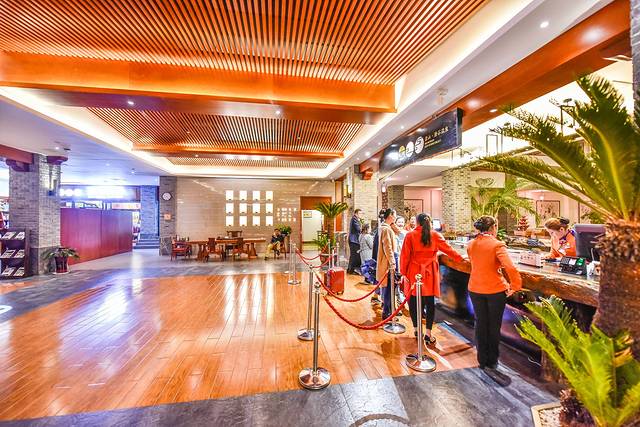 步入大厅会发现整个大厅设计非常的奢华,尤其是一些红木制作而成的太师椅以及皇家专用的家具用品等等。大厅正中间是前台服务处,左侧是通往温泉区域而右侧则是通往客房部的,布局比较清晰明了。
