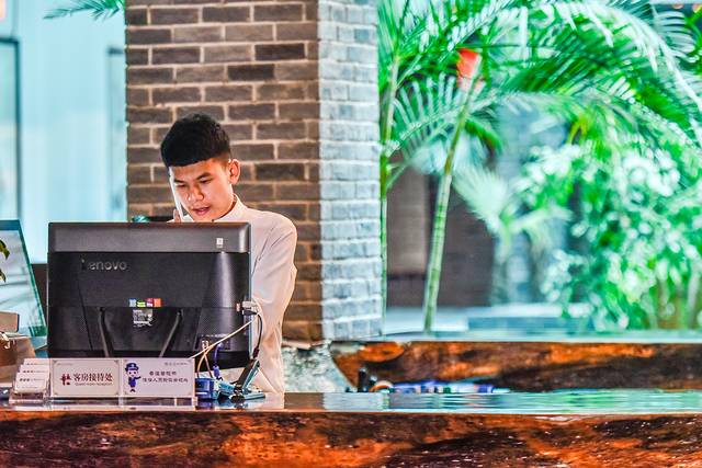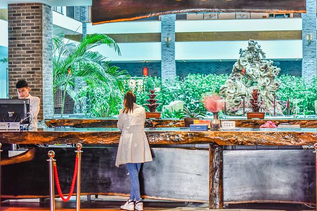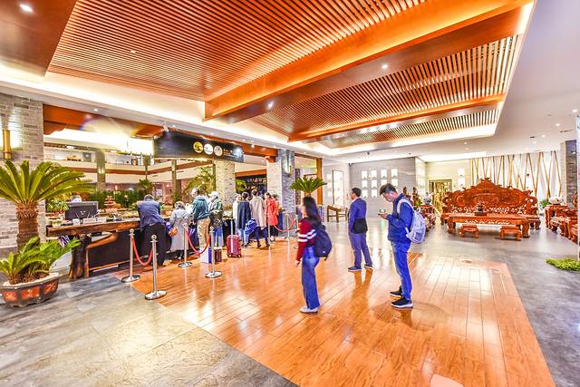 在我们进入大厅的时候,才发现这是一家至少四星级酒店的标准来打造的度假型酒店。门口除了宽敞的停车场之外就是足够的绿色花园区域,从酒店门口广场下去即可到一个环湖的花园了。在这可以与三朋四友闲聊,也可以独自思考问题。在进入酒店之前,门口的屏风设计的非常漂亮,除了起到阻挡外界山峰的冲煞问题之外,还起到了调节室内与室外之间的阴阳平衡的问题,设计方面颇具匠心。无论是在大厅里还是在客房过道里都能寻找到高端度假酒店里应有的环境,尤其是在客房楼层,地毯非常的舒服,环境非常的好。