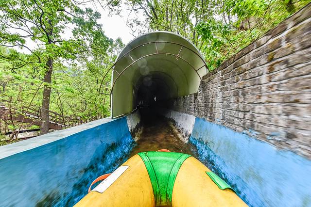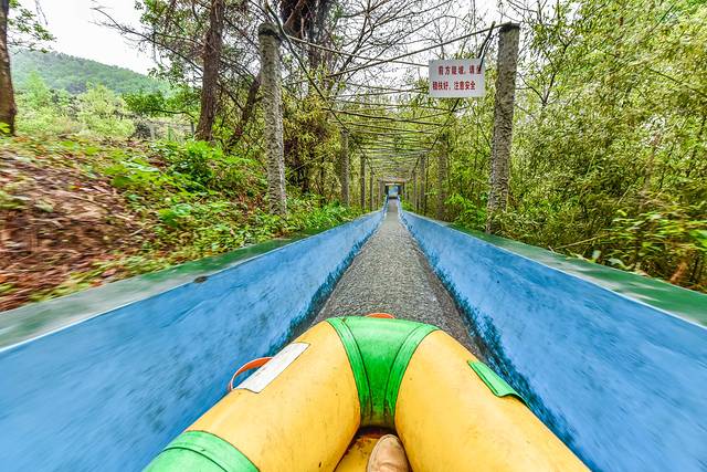 沂蒙山森林漂流属于人工蓄水开掘出来的一条人工漂流河,整个“河流”就像是铁路线一样狭窄而平缓,有一些高低上下坡度的地方,属于森林漂流里的轨道性漂流项目,非常的有意思。