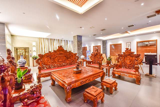 一些红木制作而成的太师椅以及皇家专用的家具用品等等。大厅正中间是前台服务处,左侧是通往温泉区域而右侧则是通往客房部的,布局比较清晰明了。